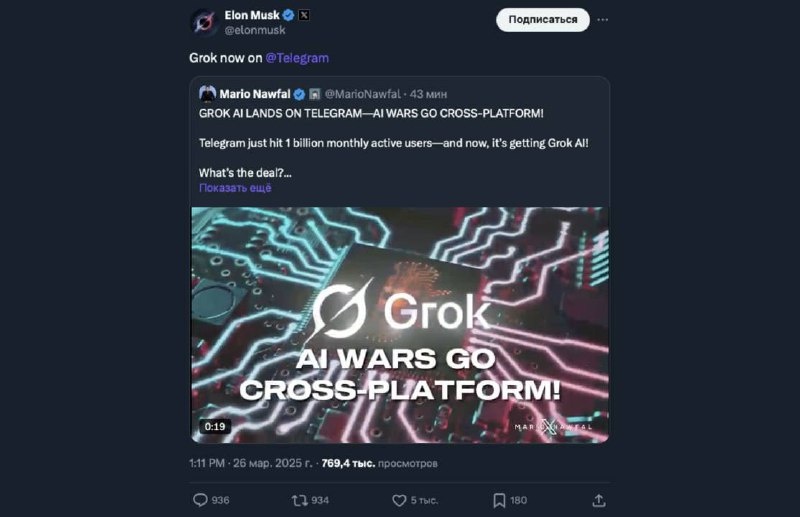 Илон Маск подтвердил, что Grok стал доступен в виде Telegram-бота Илон Маск опубликовал в X пост, в котором подтвердил, что языковая модель Grok теперь доступна в виде Telegram-бота. Такое же сообщение появилось в официальном профиле Grok в X. 🧠TechObserve