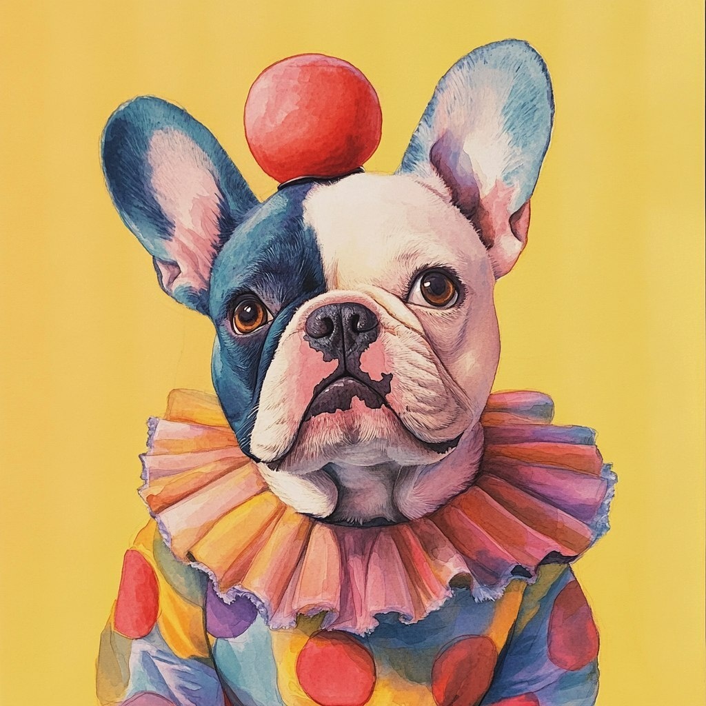 Создано на основе запроса: gouache and watercolor portrait of a French bull dog, dressed as a clown, pastel colors, candid expression