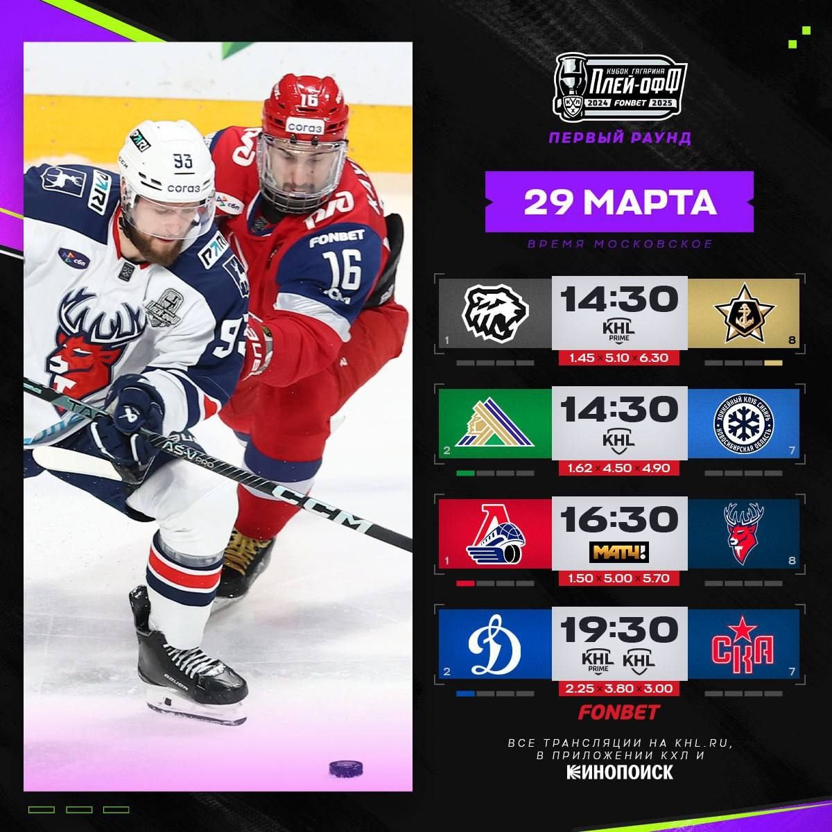 Плей-офф КХЛ продолжится четырьмя матчами: «Трактор», «Сибирь», «Торпедо» и СКА: кто сравняет счёт в серии? 🐻❄️ 🗺 ⚓ Продолжат ли «моряки» творить сенсацию в Челябинске? Несмотря на все турнирные расклады по итогам регулярного чемпионата, «Адмирал» на своём примере наглядно показал, что плей-офф – это совершенно иной турнир. «Моряки», занявшие восьмое место на Востоке, в первом матче серии на выезде одолели выигравший конференцию «Трактор» (5:4). 🍯 🗺 ❄️ Реабилитируется ли «Сибирь» за провальный старт плей-офф? Самая крупная победа на старте первого раунда плей-офф была зафиксирована в Уфе, где хозяева не оставили никаких шансов «Сибири» (7:0). Команда Вадима Епанчинцева имела игровые проблемы к финишу регулярки, однако подобное фиаско всё равно было слабо прогнозируемым. 🚂 🗺🦌Продолжит ли «Локомотив» путь к выходу во второй раунд? Результат первого матча между соперниками не оказался сенсационным. «Локомотив» продемонстрировал свои сильные качества и победил со счётом 3:1.