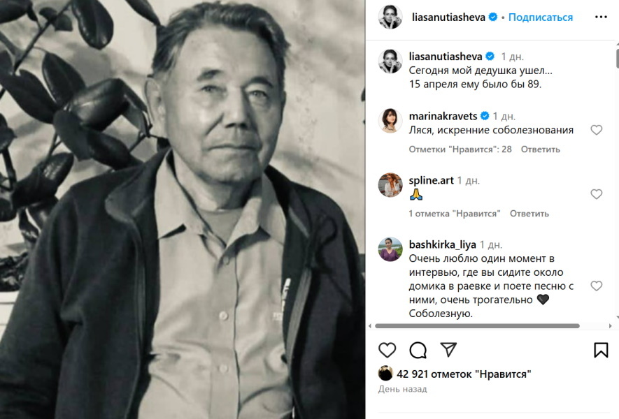 Теперь Утяшева вновь столкнулась с потерей. Накануне, 27 марта, она поделилась печальными новостями – в Башкирии скончался ее любимый дедушка. В середине апреля Султангарею Кираеву могло бы исполниться 89 лет, однако он так и не дожил до своего дня рождения. На протяжении последних 20-ти лет Султангарей Адилгареевич являлся почетным жителем Альшеевского района. В молодости инициативный мужчина трудился в местном райсовете, где также всегда был на хорошем счету.