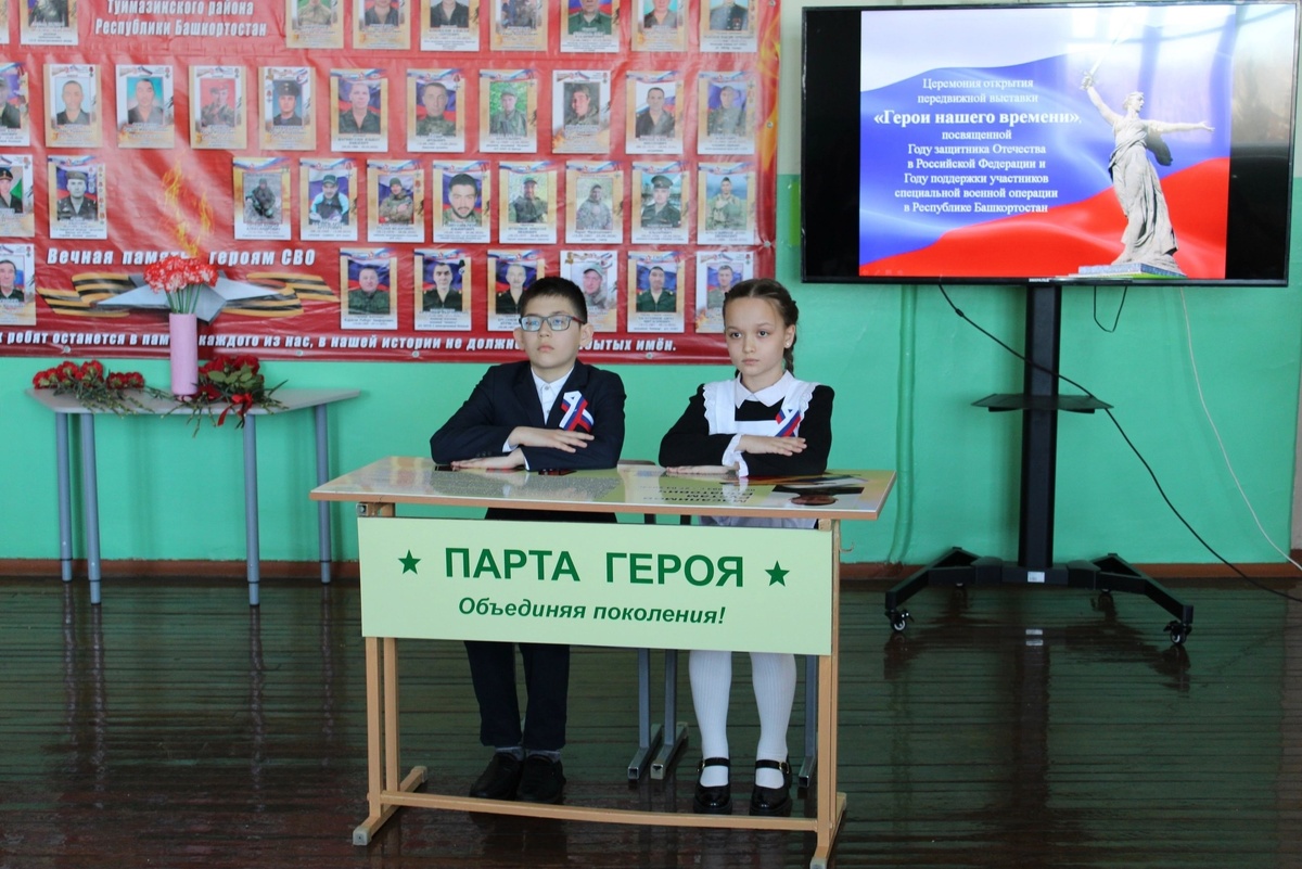 Выставка будет работать в школе №1 села Кандры до 7 апреля. В школе № 1 села Кандры состоялась торжественная церемония открытия передвижной выставки «Герои нашего времени» и «Парты Героя». На мемориальном баннере размещены фотографии и фамилии 88 туймазинских воинов, которые по зову Родины и сердца встали на защиту мирных жителей ЛНР и ДНР. На мероприятии присутствовали заместитель главы администрации сельского поселения Кандринский сельсовет Гульчачак Шарипова, кавалер Ордена Красной Звезды, председатель организации ветеранов боевых действий «Серпантин», Почетный гражданин Туймазинского района Биккинин Василий Степанович, родные и близкие военнослужащих, погибших на СВО, учителя и учащиеся. Организовали мероприятие советник директора по воспитанию Гузель Галлямова и учителя истории Зульфия Латыпова, Элеонора Сираева. Вдова сержанта, старшего наводчика взвода минометной батареи 72-й бригады Дмитрия Борисовича Сахаутдинова Айгуль Хамитовна рассказала о том, как появился этот проект. По