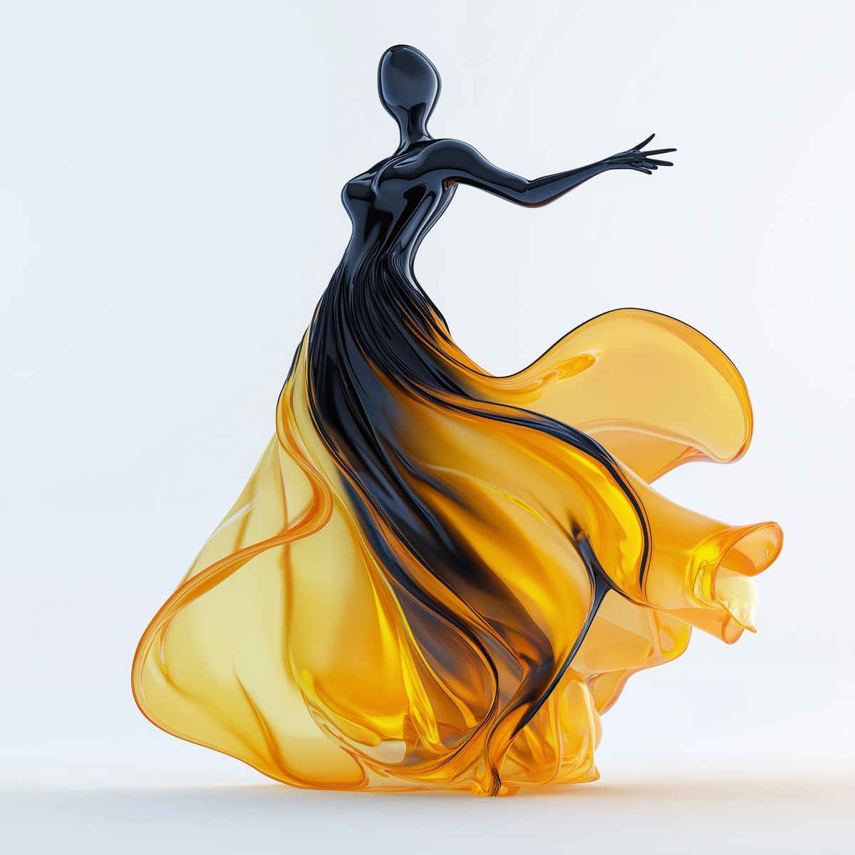 Создано на основе запроса: 3D rendering, digital art, abstract sculpture of a very voloptuous woman shilouette in a black and yellow flowing dress, glass material with light reflection, white background, minimalist style, surrealism, high resolution, futuristic technological sense, strong contrast between the cold blue and warm orange colors, high level of detail, hyper-realistic quality, high definition.