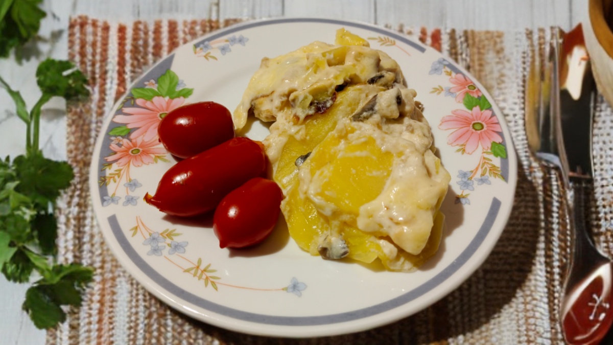 Гратен – простое в приготовлении блюдо французской кухни, где главным ингредиентом выступает картофель, нарезанный тоненькими слайсами. Особую нежность и сочность запеканке придает соус на основе сливок, а неповторимый вкус достигается благодаря гармоничному сочетанию чеснока, мускатного ореха, тимьяна и черного перца. Вариантов гратена немало, предлагаю приготовить блюдо с добавлением шампиньонов, хотя в классическом рецепте используется только картофель, сливки, масло, мускатный орех и чеснок. Процесс приготовления гратена включает два основных этапа. На первом этапе блюдо доводится практически до готовности, после чего его украшают слоем сыра и отправляют обратно в духовку. Такой подход обеспечивает образование аппетитной золотистой корочки, сохраняя при этом сочность внутри. Это блюдо прекрасно выступает как в роли основного кушанья, так и в качестве гарнира. Гратен великолепно дополнит запеченную рыбку, сочные свиные стейки или нежное куриное филе. Нам понадобится: · картофель –