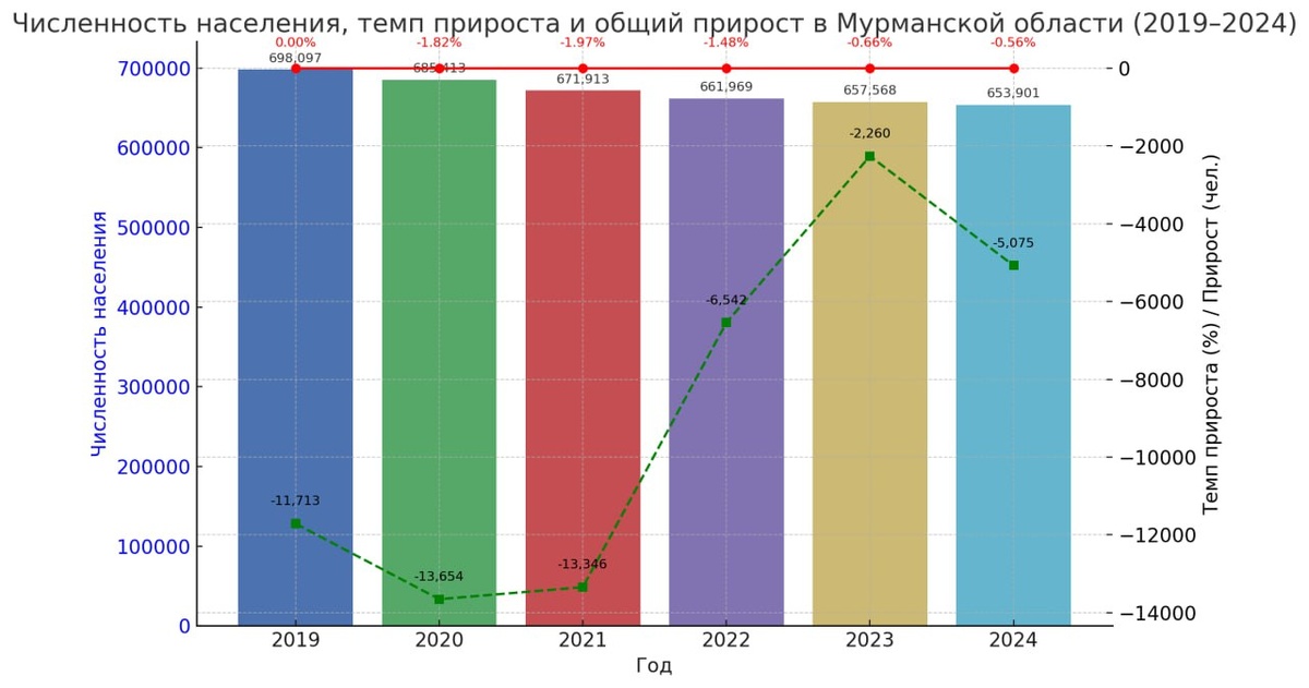 Росстат: Численность постоянного населения Мурманской области на 1 января 2025 года составила 651 363 человек (среднее значение за 2024 год – 653 901 человек). Общий прирост населения имеет отрицательное значение, то есть, констатируется убыль – в 2024 года она составила -5 075 человек (удвоилось по сравнению с 2023 годом).