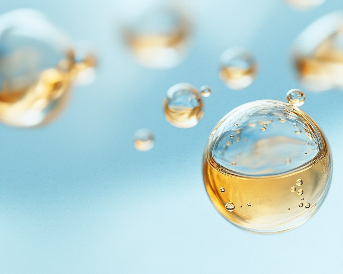 Создано на основе запроса: few drops of golden yellow essence water float on the light blue background, forming clear and transparent