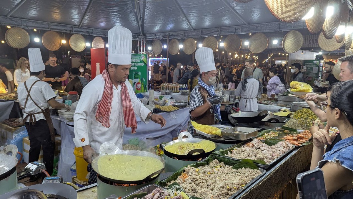 С 28 марта по 1 апреля 2025 в Дананге проходит гастрономический фестиваль 🥳! Полную программу можно посмотреть на сайте https://danangfantasticity.com/en/dem-nguoc/le-hoi-danang-food-tour-festival-2025 - а мы вчера уже сходили на открытие в East Sea Park. В целом фестиваль напомнил один большой ночной рынок со странными сладостями, выступлениями и пышущими котлами. С одной стороны, на прилавках много разнообразных разноцветных блюд, и поначалу глаза разбегаются. С другой стороны, 🤨 приглядевшись, понимаешь, что половина из этого - вполне классическая азиатская еда вроде сукияки и шашлычков на гриле 🍡🍢, тайского мороженого или риса во всех возможных формах. Признаться, я ожидала больше вьетнамских традиционных блюд 🇻🇳 - от Бунчи и Немов до чего-нибудь совсем непривычного в наших краях - но никаких особых блюд по регионам не было. Высокой кухни тоже не наблюдалось: готовят в основном простые и зрелищные блюда. Видели, например, огромные местные блины Banh Xeo - но они в итоге ок