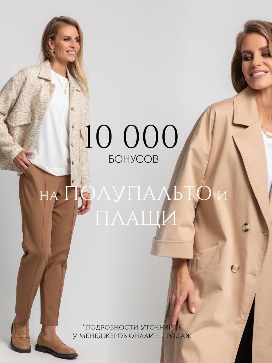 Вам начислено 10 000 бонусов на полупальто и плащи! Весна – это время, когда лёгкое пальто становится необходимостью, защищая от переменчивой погоды и при этом подчёркивая Ваш безупречный вкус. А так как демисезон у нас дважды в год, то это особенно актуальное предложение! Воспользуйтесь преимуществами бонусной программы - используйте Ваши 10 000 бонусов для оплаты 30% стоимости выбранного плаща или полупальто. Позвольте себе роскошь окунуться в мир благородных тканей, элегантных силуэтов и безупречного кроя, созданных для того, чтобы Вы ощущали уверенность в каждом движении!
