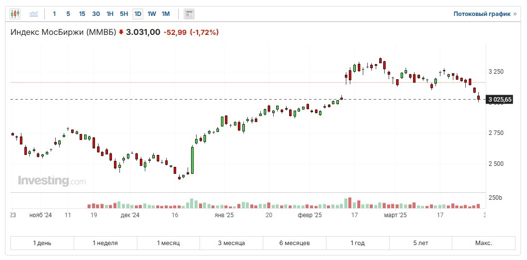 Февральско-мартовско-трамповский оптимизм на российском фондовом рынке, который я не раз называл нелогичным и нездоровым, сдулся. Успев побывать в районе 3370 пунктов, индекс Мосбиржи вернулся обратно к 3000 (упал от максимумов более чем на 10%). Гэп, возникший в середине февраля на новостях о планирующемся созвоне Путина и Трампа, закрыт. В пятницу на вечерней сессии рынок продолжил падение и второй раз за день близко-близко подошел к отметке 3000 по индексу. Такие отметки очень редко пробиваются с первого раза, поэтому я скорее склоняюсь к мнению, что от нее рынок отскочит вверх, но это чисто технически-теоретически, а фундаментально - все будет зависеть от того, кто там что еще наговорит. Причин такого падения оптимизма на рынке вижу три: Первая и главная причина - надежды на Трампа не оправдались, переговоры, похоже, зашли в тупик и в реальности не приводят вообще ни к чему. Пока Трамп с завидным постоянством твердит о каких-то успехах, только ему известных, риторика другого презид