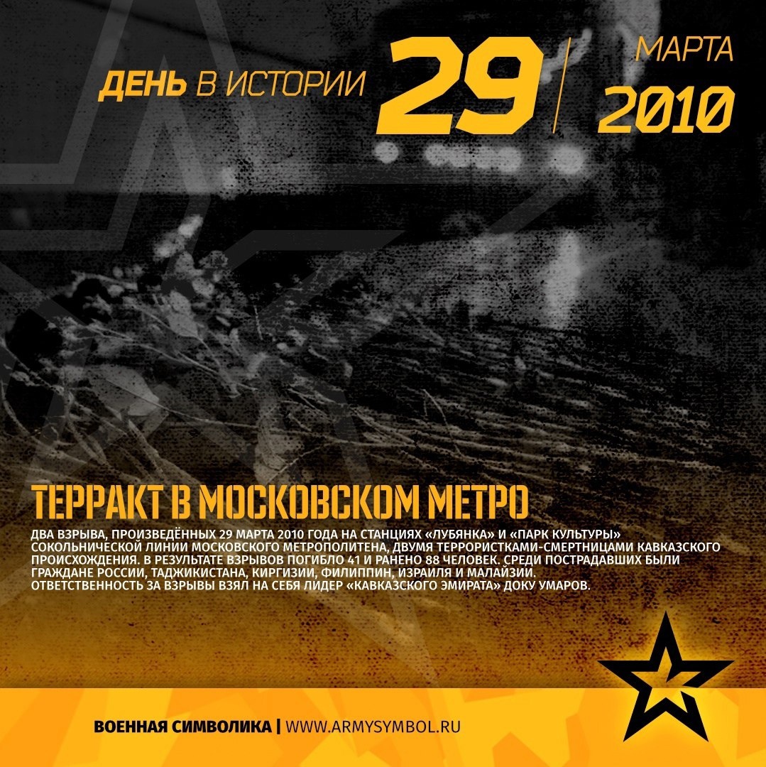 Теракт в Московском метро в 2010 Два взрыва, произведённых 29 марта 2010 года на станциях «Лубянка» и «Парк культуры» Сокольнической линии московского метрополитена, двумя террористками-смертницами кавказского происхождения. В результате взрывов погибло 41 и ранено 88 человек. Среди пострадавших были граждане России, Таджикистана, Киргизии, Филиппин, Израиля и Малайзии. Ответственность за взрывы взял на себя лидер «Кавказского эмирата» Доку Умаров. #ПамятныеДатыВоеннойИсторииОтечества #ДеньВИстории #ГодЗащитникаОтечества #80ЛетВеликойПобеды Источник: https://vk.com/wall-60767131_30254 Подпишитесь на наши группы ВКонтакте и в Одноклассниках - читайте, смотрите и комментируйте! Источник