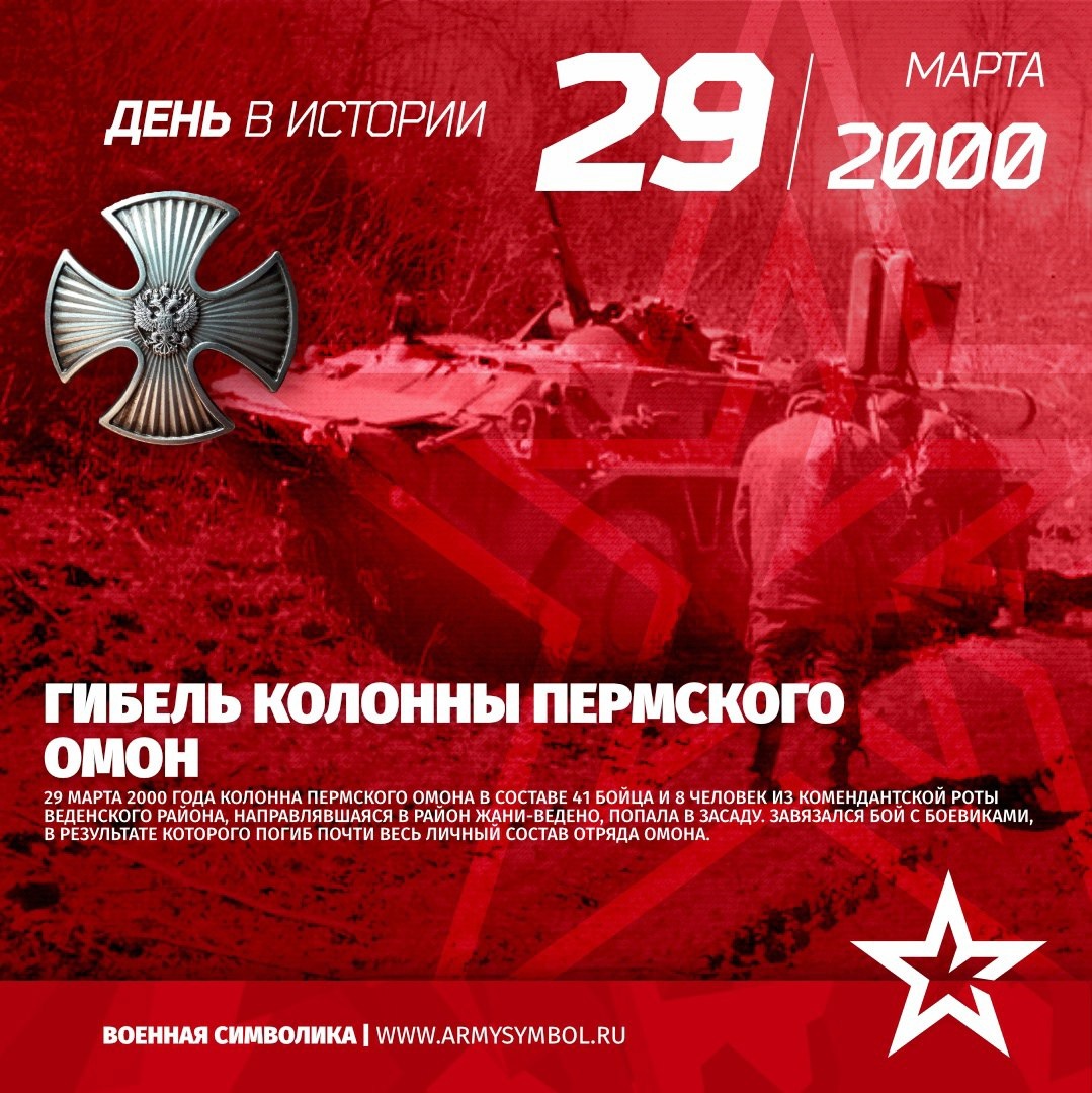 Гибель Колонны Пермского ОМОН в 2000 29 марта 2000 года колонна Пермского ОМОНа в составе 41 бойца и 8 человек из комендантской роты Веденского района, направлявшаяся в район Жани-Ведено, попала в засаду. Завязался бой с боевиками, в результате которого погиб почти весь личный состав отряда ОМОНа. #ПамятныеДатыВоеннойИсторииОтечества #ДеньВИстории #ГодЗащитникаОтечества #80ЛетВеликойПобеды Источник: https://vk.com/wall-60767131_30253 Подпишитесь на наши группы ВКонтакте и в Одноклассниках - читайте, смотрите и комментируйте! Источник