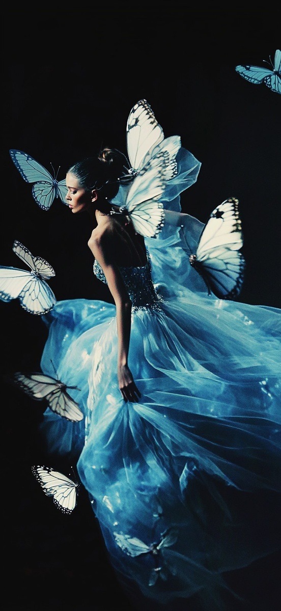 Создано на основе запроса: Bridal Wedding Dresses Guide: Tim Walker's Fashion Runway Show. A supermodel wearing a blue dress with white butterfly wings is walking down the catwalk. The background is black, and the model's face can be seen in full detail. The photo was shot on an iPhone 5s with an Instagram filter and taken from above using the iPhone camera. It was posted to Reddit in 2018, and there are no text or logos in the picture.
