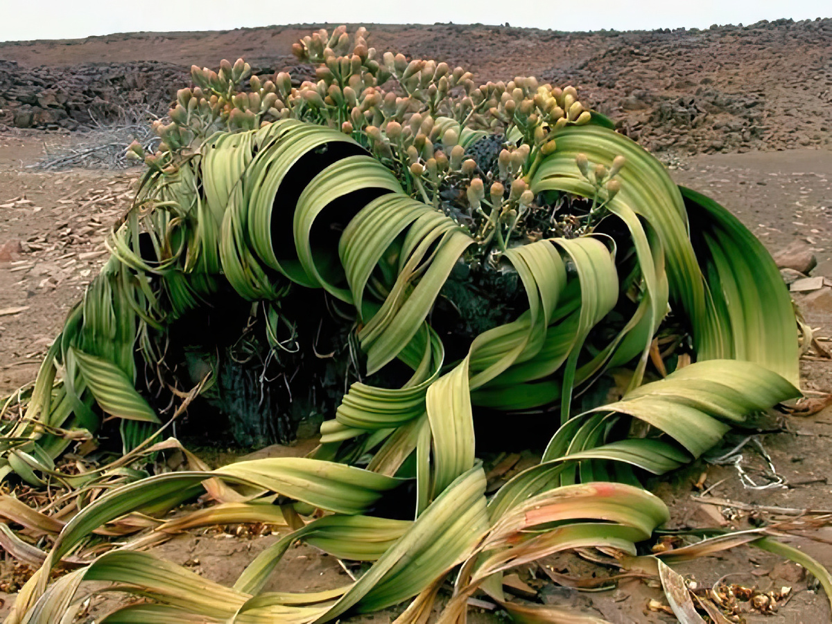 В раскаленных песках африканских пустынь, где жизнь кажется невозможной, прячется настоящее чудо эволюции — Welwitschia mirabilis. Этот ботанический феномен, прозванный «пустынным фениксом», существует на планете со времен динозавров, а отдельные экземпляры живут свыше 10 веков! Растение-легенда, встречающееся только в Намибии и Анголе, стало символом непокорности: оно выживает под палящим солнцем, в условиях, где годовые осадки едва достигают 2 см. В отличие от привычных растений, вельвичия за всю жизнь выращивает всего два листа. Но кажется, будто она заключила сделку со временем: лентообразные листья растут десятилетиями, разрываясь на полосы от ветра и превращаясь в хаотичный «ковер» длиной до 13 метров! Этот живой веер работает как природная ловушка: капли утреннего тумана оседают на его поверхности, давая растению драгоценную влагу. А под землей скрывается стержневой корень, уходящий на 3 метра вглубь, чтобы добыть воду из подземных резервуаров. Почему вельвичия не сдается под на