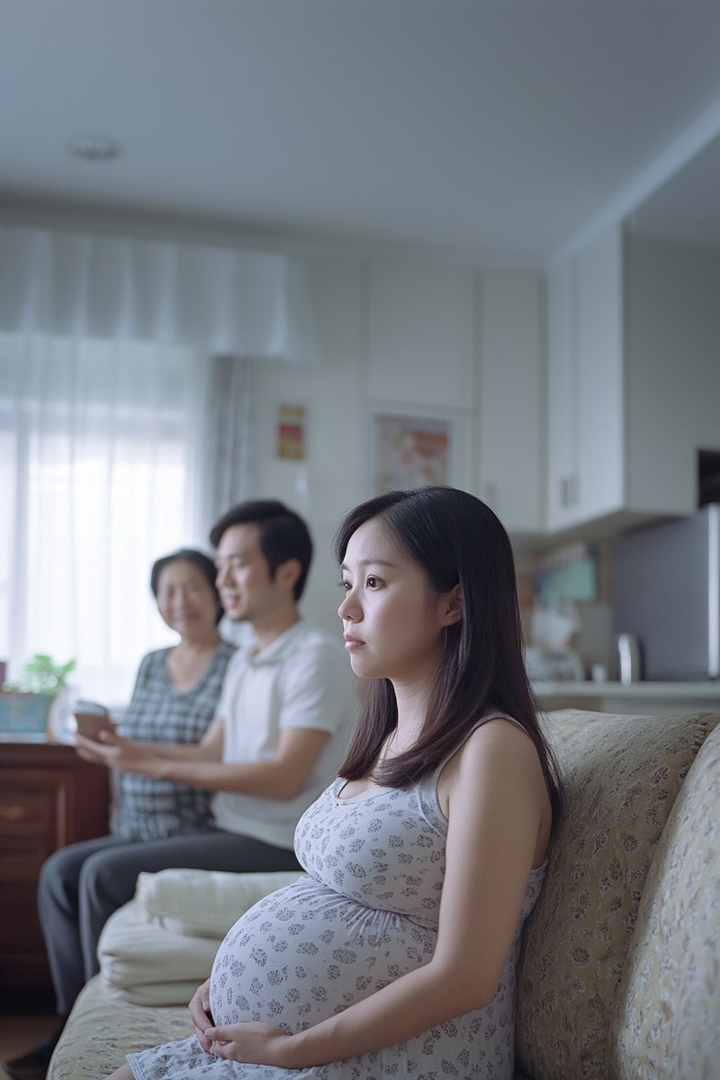 Создано на основе запроса: A 26-year-old Asian pregnant woman (8 months) sits on a sofa, her eyes staring blankly ahead, lost in thought. Behind the sofa, the kitchen is visible, where her 30-year-old husband is happily chatting with his 50-year-old mother. Their cheerful conversation contrasts sharply with the woman’s somber mood. The background is bright and well-lit. Aspect ratio 9:16.