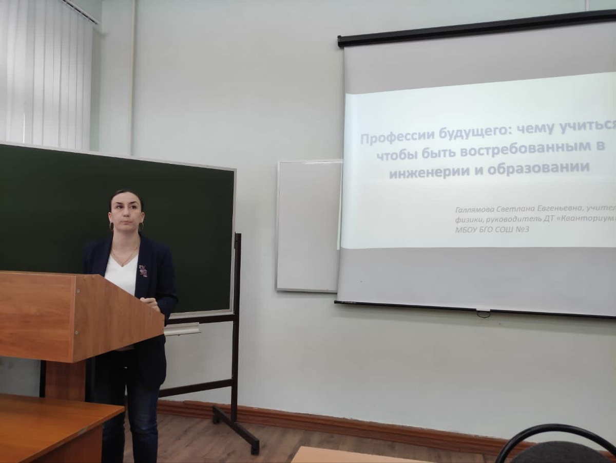 Поделилась со студентами, будущими педагогами тенденциями в сфере образования, рассказала о современной школе, школьном технопарке "Кванториум" и, конечно, пригласила ребят в школьный технопарк.
