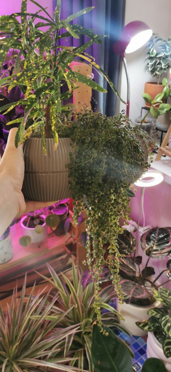 🪴Приятное соседство. В одном кашпо у меня посажены Пилея Депресса и Кодеум (выращивается как бансай на стволе). За время их вынужденного соседства Пилея разрослась и стала красиво спускать свои побеги вниз. А Кодеум становится пышным и ярким👍 #Комнатные_растения Цветочный чат🌺https://t.me/TsvetochniyChat