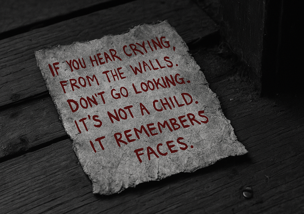 Это перевод истории с Reddit 12 июня Я нашёл эту записку, когда разбирал коробки в своей новой квартире. Одна из досок в полу рядом с шкафом в спальне была неплотно закреплена, и под ней лежал пожелтевший клочок бумаги. Почерк был таким судорожным, что в некоторых местах ручка прорвала лист: «Если услышишь плач из стен, НЕ ИДИ СМОТРЕТЬ. Это не ребёнок. Оно запоминает лица». Я рассмеялся. Подумал, что это чья-то мрачная шутка в готическом стиле. Скомкал бумажку и выкинул. Большая ошибка. 17 июня Впервые я услышал это в три часа ночи и решил, что мне приснилось. 3:07 утра. Позже я пойму, что это одно и то же время каждую ночь. Детский плач, приглушённый, но совершенно отчётливый, раздавался из западной стены. Я проверил — это не трубы. И не соседи — стены здесь из толстого бетона. Просто рыдания, от которых сжималось сердце, настолько они звучали по-настоящему. Я прижал ухо к стене. Плач затих. А затем, прямо у моего уха, от чего у меня побежали мурашки по коже, раздалось: «Я тоже тебя