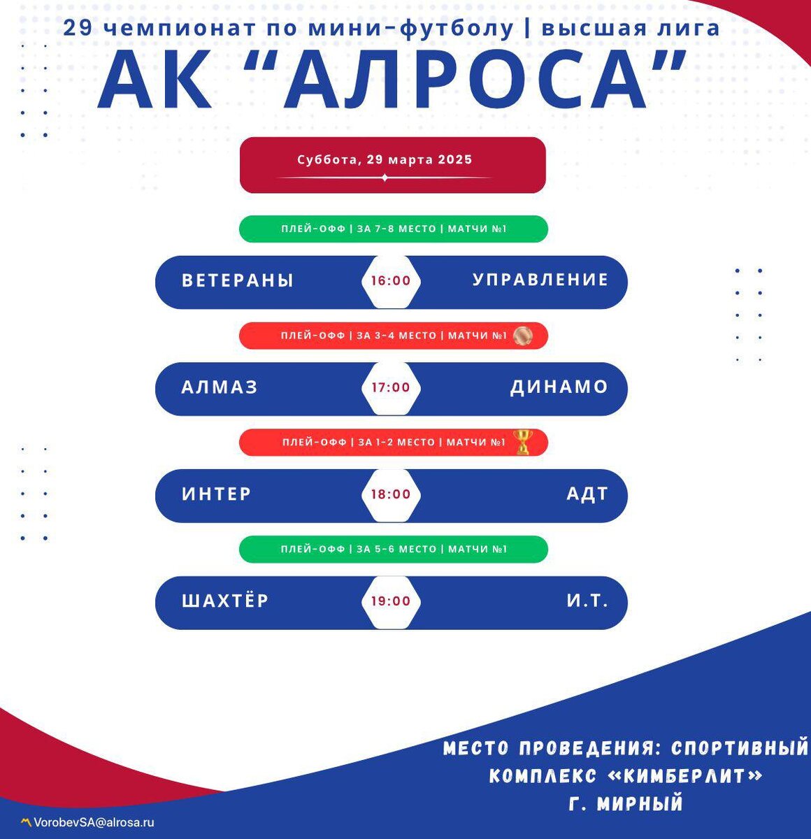 Сейчас начнём трансляцию заключительных матчей чемпионат АЛРОСА по мини-футболу! ⚽️ Будут играть команды высшей лиги за 7-8, 5-6, 3-4, 1-2 место в формате плей-офф. Расписание: 16:00 - матч «Ветераны» — «Управление» 17:00 - матч «Алмаз» — «Динамо» 18:00 - матч «Интер» — «АДТ» 19:00 - матч «Шахтёр» — «И.Т.» Все матчи можно посмотреть в прямом эфире на нашей трансляции во ВКонтакте, начало в 16:00! 💙 Прямая трансляция во ВКонтакте. ⚪ Подписаться | Прислать новость