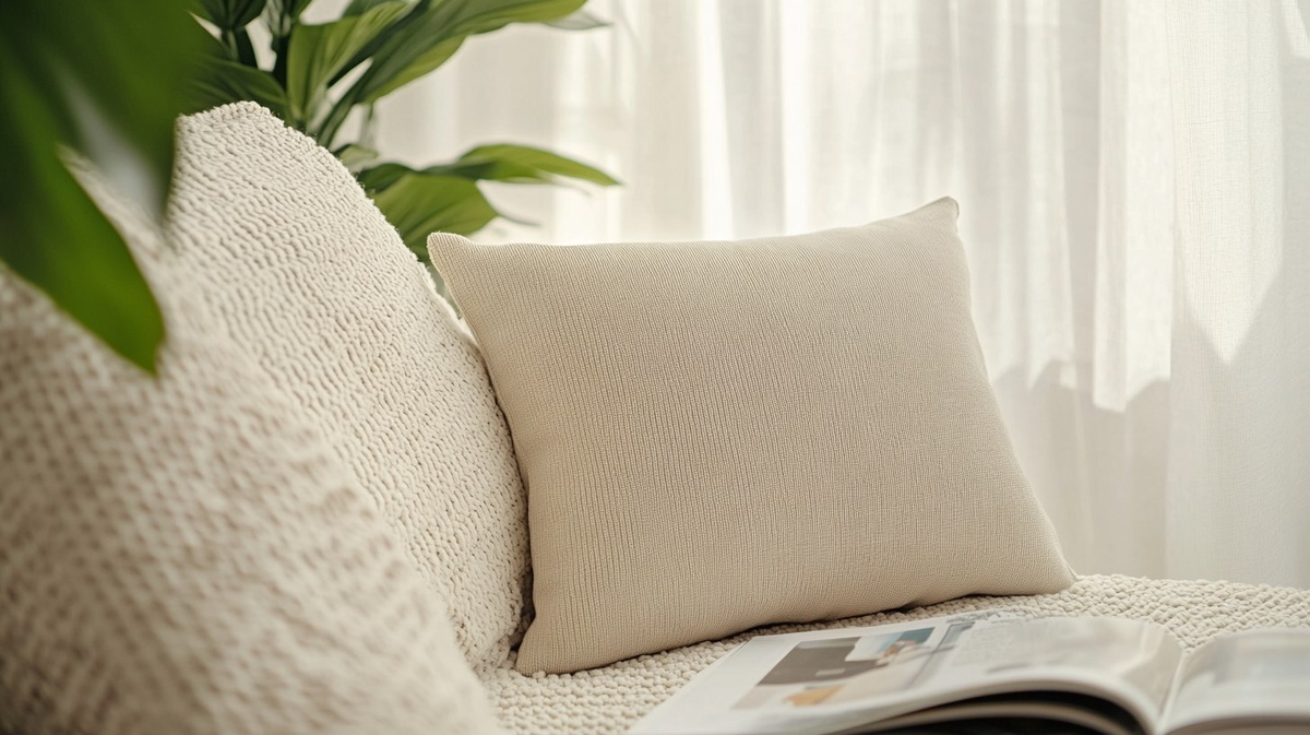 Создано на основе запроса: A beige square pillow is the main subject, placed on a cream knitted armchair with a textured surface in a bright, cozy corner. A green leafy plant in the background adds a natural touch. A book with a modern cover lies on the armrest, and part of a magazine is seen at the bottom. Soft daylight filters through a sheer white curtain, creating a calm and relaxing atmosphere. Focus on the pillow, neutral tones, minimalist interior style.