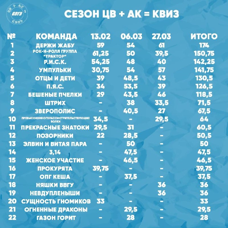 Спешим подвести итоги квиза «Из России с любовью»✈️ С рейтингом команд ты можешь ознакомиться на картинке, а сейчас представим тебе победителей квиза: 🥇Держи жабу 🥈УМПульки 🥉Бешеные пчёлки Самая стильная команда: Держи Жабу Выражаем благодарность нашим партнерам квиза: 🖇Грузинский ресторан «Супра» 🖇ЦОПП 🖇Slavda 🖇Магазин кроссовок «Кроссы|Точка.» 🖇Lumos concert А пока мы готовим для вас следующий квиз, смотрите как это было в нашем фотоотчете и регистрируй команду на следующий квиз, который состоится 17 апреля 📸