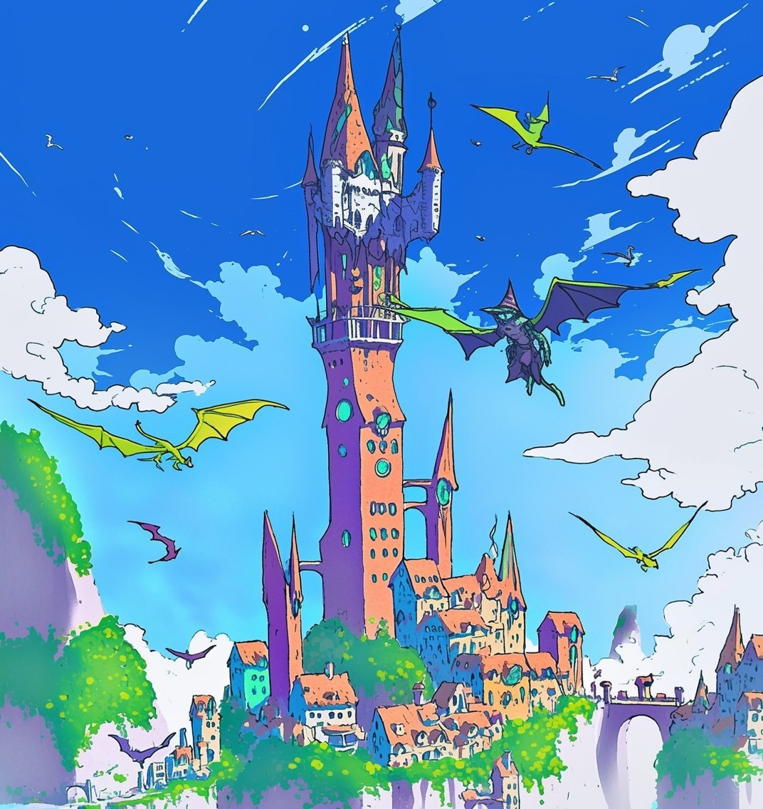 Создано на основе запроса: colorful magipunk wizard towers on floatinf sky-islands, flying ghosts and dragons