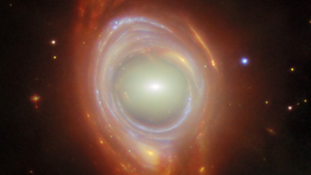Это искаженный вид двух удаленных галактик в созвездии Гидра. В ярком центре расположена одна, а вытянутые оранжевые и голубые цвета вокруг нее — это свет от другой галактики, находящейся за первой. Свет от более удаленной галактики выглядит как кольцо из-за гравитационного линзирования.