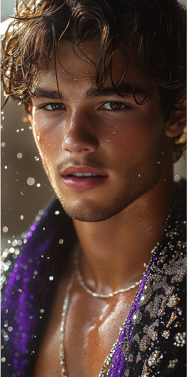 Создано на основе запроса: a high school senior regal prince wearing a tight black and purple encrusted diamond robe his muscles showing