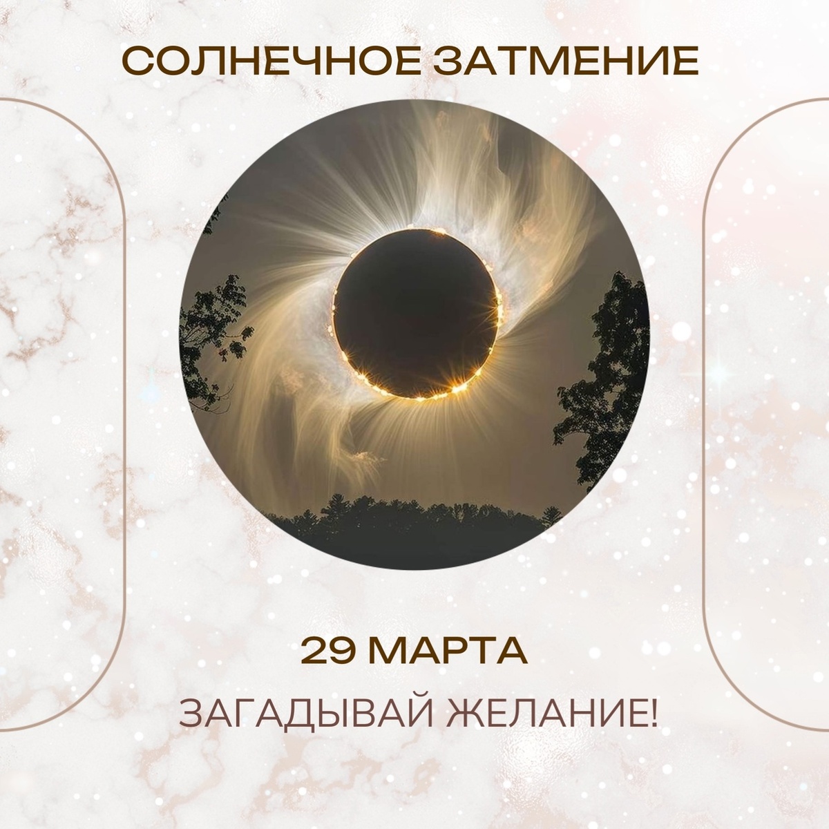 29 марта в 15:09 (+-20 минут) нас ожидает частное Солнечное затмение - это волшебное, мощное время! Это то время, которое используют все астрологи и шаманы всего мира для проведения практики исполнения желаний! За 20 минут до точного времени затмения примите душ, переоденьтесь в чистую одежду, зажгите свечу и представьте или запишите какой вы видите свою будущую жизнь. В этот период будет открыт прямой канал с Высшими силами!Это время для загадывания желаний на ПРИВЛЕЧЕНИЕ в свою жизнь: • Энергии, силы, активности • Красивой внешности, красивого, здорового, подтянутого тела • Партнеров как личных, так и деловых. Поэтому, если хотите наладить свою личную жизнь, привлечь достойного мужчину - используйте эту практику обязательно • Определенных черт характера, которые хотите приобрести Не распыляйтесь на много желаний, сконцентрируйтесь на том, что сейчас является самым важным и приоритетным именно для вас. Желания должны касаться только вас лично, нельзя загадывать желания для други