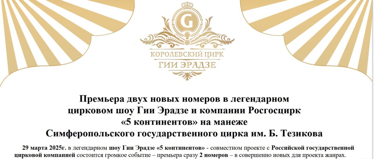 Итак, на днях Гия Эрадзе прибыл в Симферополь, и проверил, всё ли готово к премьере новых номеров для шоу "5 континентов". На генеральном прогоне этих номеров Борис Борисович Тезиков - директор-художественный руководитель «Симферопольского государственного цирка имени Б. Тезикова» выразил свою благодарность и восхищение всем тем, кто так долго и плодотворно трудился над новыми цирковыми шедеврами! Представление начнётся сегодня в 17.00, а после шоу, обещают пресс-подход и возможность пообщаться с создателями и артистами проекта, задать все интересующие вопросы и получить ответы из первых уст! Если есть вопросы, — задавайте, есть шанс получить ответы..... Напомню, что наш человек в Крыму побывает на этом замечательном мероприятии, так что ждите репортаж, скорее всего, завтра утром! Хотя, может быть, что-то получиться переслать мне в антракте. А уж я обязательно поделюсь с вами, наши уважаемые подписчики, читатели и смотрители Arenadoc! Ваш Редактор