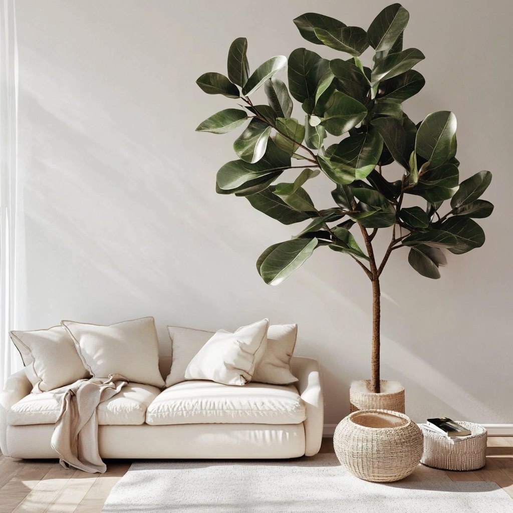 Создано на основе запроса: White wall, living room, sofa, scandinavian style, Kobus Magnolia overwhelming size decoration on plant table