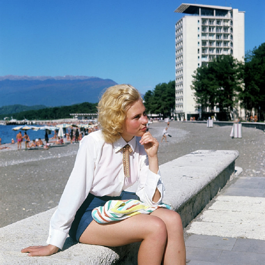 Это скорее всего конец 70-х, начало 80-х. Красивая блондинка позирует где-то на Черноморском побережье Крыма, или даже Сочи. Обратите внимание на ее руки — никаких полуметровых ногтей, как сейчас. Все очень скромно, несмотря на кокетливо подобранную юбку. На волосах модная завивка, призванная сделать красавицу более привлекательной.