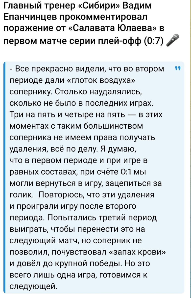 Все прекрасно видят кто разбирается чутка в хоккее что это дело не во втором периоде и не в удалениях дело,тут дело в бардаке внутри команды начиная с первых игр,тренера просто потеряли контроль над игроками с первых игр ,увольняют в начале сезона тренера по физподготовке не дав объяснения этому ,по моей инфе в команде действует группировки ,местные с местными ,нету в коллективе единства ,в конце чемпа был яркий пример когда очень слабый Бэк уходит в раздевалку когда играть ещё оставалась минут 5,и объясняет что удалился бы до конца игры и словил бы штраф денежный,серьезноооооо??????))))) человек получает огромные деньги и лепит горбатого ,честно говоря команда Сибирь это сбитые лётчики ,в другие клубы игроков не берут и все едут в Сибирь заканчивать ,и при счёте 7-0 в плей-офф тренер даёт такое интервью что типо не чего страшного не случилось ,подумаешь всего лишь одна игра ,да согласен это всего одна игра ,но в плей-офф так нельзя играть ,и помнится в том году после 7-0 в авангарде