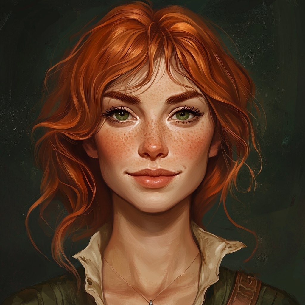 Создано на основе запроса: dnd character portrait, medieval style, female woman, about 35 years old, copper-red hair, which is cut short and sticks out here and there, long bangs fall over the green, mocking eyes, small nose with freckles, dimples on the cheeks, friendly smile