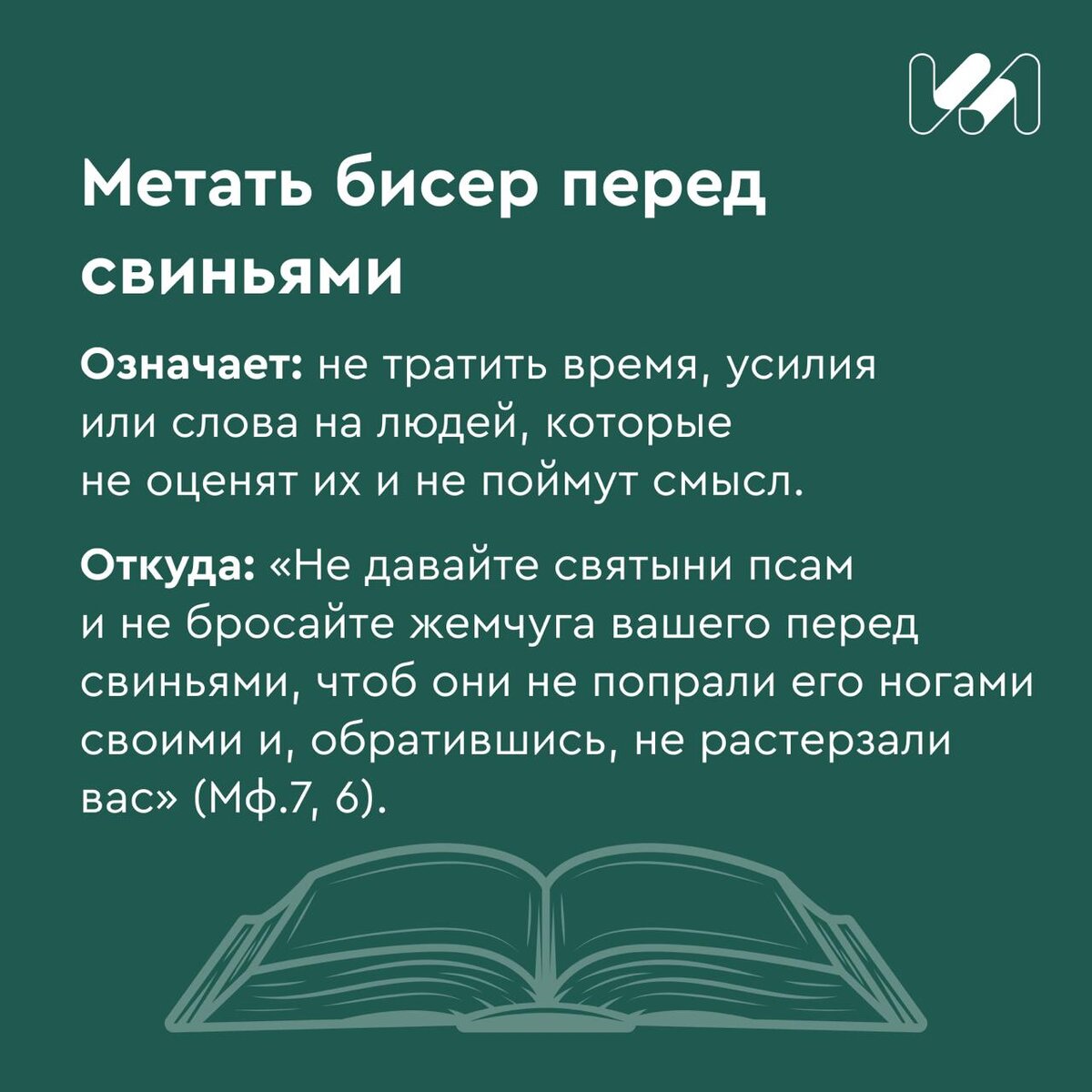 По-церковнославянски: «Ни пометайте бисер ваших пред свиниями». Слово «бисер» значит «жемчуг». Святитель Иоанн Златоуст, трактуя этот отрывок из проповеди Христа, говорит, что под псами подразумеваются люди, живущие без желания стать лучше, а под свиньями — те, кто живет невоздержанно и распутно. Все они недостойны услышать Слово Господа, потому что не поймут его или, более того, используют во вред тому, кто пытается его донести с благими целями. 📜 В нашей рубрике «Крылатые выражения» продолжаем знакомить вас с происхождением большинства распространенных фразеологизмов и рассказываем об их первоначальном смысле. Клевер Лаборатория