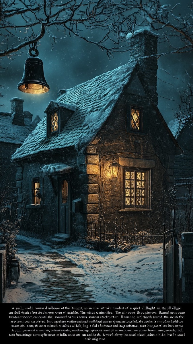 Создано на основе запроса: "A small, isolated house on the outskirts of a quiet village. Every night, an old bell rings at the stroke of midnight though no bell is visible. The windows are frosted over, concealing the interior, and the sound seems to come closer each time. Haunting and mysterious." --- Автоперевод: «Небольшой, изолированный дом на окраине тихой деревни. Каждый вечер старый колокол звонит в полуночи, хотя колокола не видно. Окна заморозили, скрывая интерьер, и звук, кажется, приближается каждый раз. Призрачные и таинственные». Как тебе эта иллюстрация? 🤔 https://dzen.ru/id/65c0c65c86e4f837c27b24d7 #ИИ #AI #нейросеть #midjourney #art