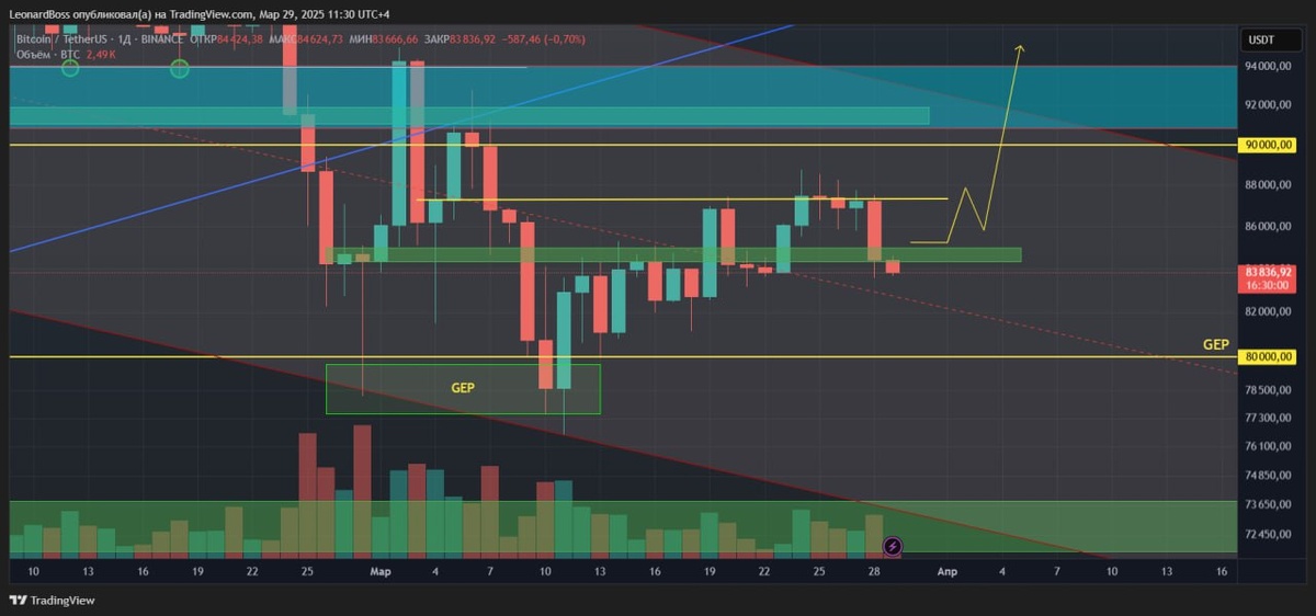 В ответ на пост #BTC 🕯Локально🕯 Коллеги, всем привет! Пока я менял аэропорты и проводил на бегу встречи, рынок закрыл большую часть моих сделок по стопам, которые я подтянул перед полётами! Думаю, плюс минус у вас такая же картина! ⚖️Знаете, когда твои сделки закрываюися стопами, возникает двоякое чувство: 😡с одной стороны, где-то в подсознании жалеешь, что в полной мере не реализованы мощные ТВХ, на которые потрачены силы и не мало времени, а их снова необходимо будь ловить!! 💵с другой стороны, когда многие вокруг сокрушаются и не выдерживая окончательно уходят с рынка, ты понимаешь, что забрал с рынка очередные 10-30% со сделки, тем самым подтверждая самому себе, свою же эффективность!! ⚠️По BTC, всё же получили пробой нижней стороны треугольника по предыдущему графику и прямо сейчас цена болтается в зоне ключевого уровня 84К. Данное снижение также связываю с банальным закрытием GEPа с прошлых выходных, о котором не упоминул ранее. Текущая зона цены полностью пере
