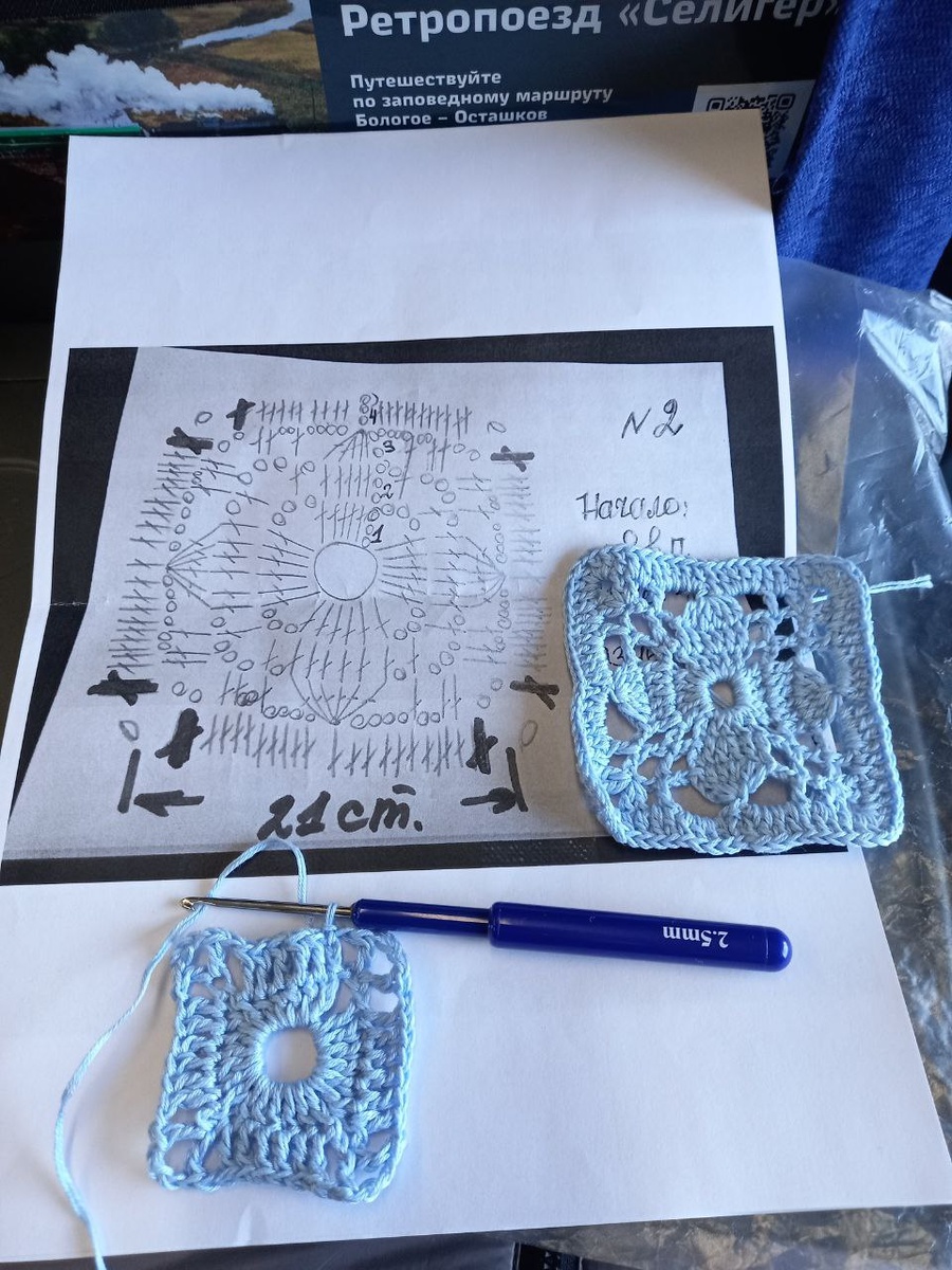 Пока ехала в экспрессе, начала вязать квадратик для пледа