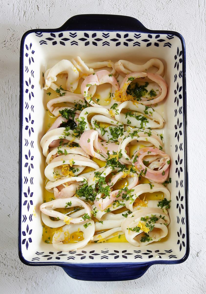 Очень интригующая и ароматная греческая закуска: если боитесь чеснока (хотя он почти не ощущается в маринаде, поверьте!), замените его на ваши любимые ароматные травы. Ингредиенты: - 1000 гр кальмары (можно использовать любых) - 150 гр оливковое масло Extra Virgin - 90 гр лимонный сок (от двух средних лимонов) - 5 гр (1 ч л) соль - 5 гр (1 ч л) сахар - 3 зубчика чеснок (можно заменить на 1 ч л листьев свежего чабреца или 1 ч л орегано) - цедра одного лимона (опционально) - пучок петушки (около 70 гр) Дополнительно: - мелкое сито для процеживания лимонного сока - венчик Приготовление: 1. Кальмаров освободите от позвоночника и внутренностей, промойте, снимите пленку, если это необходимо. Отделите ножом хвост от туловища. Туловище нарежьте кольцами толщиной около 1, 5-2 см, хвост – такими же ленточками. Поставьте на огонь кастрюлю с водой (не менее 5 л). Доведите воду до кипения. Отправьте кальмаров в кипяток и сразу убавьте температуру до самого минимума. Готовьте 7-10 минут. Зате