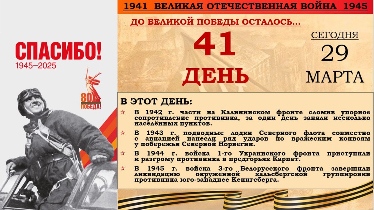 ⚡️ Годовщина Великой Победы приближается! В 1377 день войны, 29 марта 1945 года Советская Армия вышла на австрийскую границу. С боями занято более 100 населенных пунктов. Наши корабли потопили в Балтийском море два немецких транспорта общим водоизмещением в 13000 тонн. Занят Франкфурт-на-Майне. Всего, на фронтах, в этот день было подбито и уничтожено 78 немецких танков и самоходных орудий. В воздушных боях и огнем зенитной артиллерии сбито 8 самолетов противника. Отметим годовщину Победы советского народа в Великой Отечественной войне вместе!