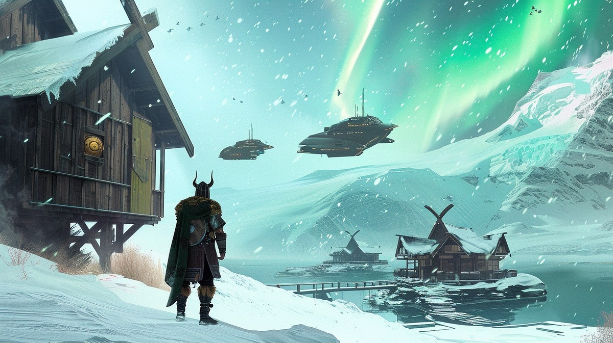 Создано на основе запроса: A Viking chieftain standing on a snowy fjord, watching massive sci-fi spaceships hovering above their wooden village, auroras in the sky, hyper-detailed, ultra-HD, --- Автоперевод: Вождь викингов, стоящий на снежном фьорде, наблюдающий за массивными научно-фантастическими космическими кораблями, которые парят над их деревянной деревней, ауроры в небе, гипердерированные, ультра-HD, Как тебе такая генерация? 🤔 https://dzen.ru/id/65c0c65c86e4f837c27b24d7 #ИИ #AI #нейросеть #midjourney #art