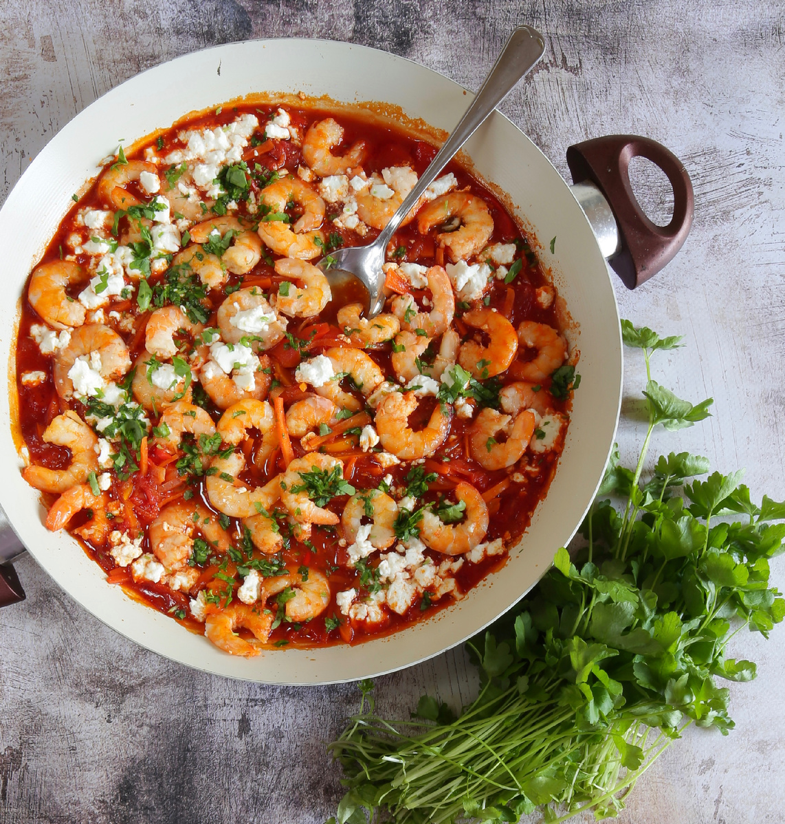 4. Готовый соус снимите с огня, добавьте креветок, перемешайте. Выложите смесь в емкость для запекания, посыпьте сверху раскрошенной брынзой.