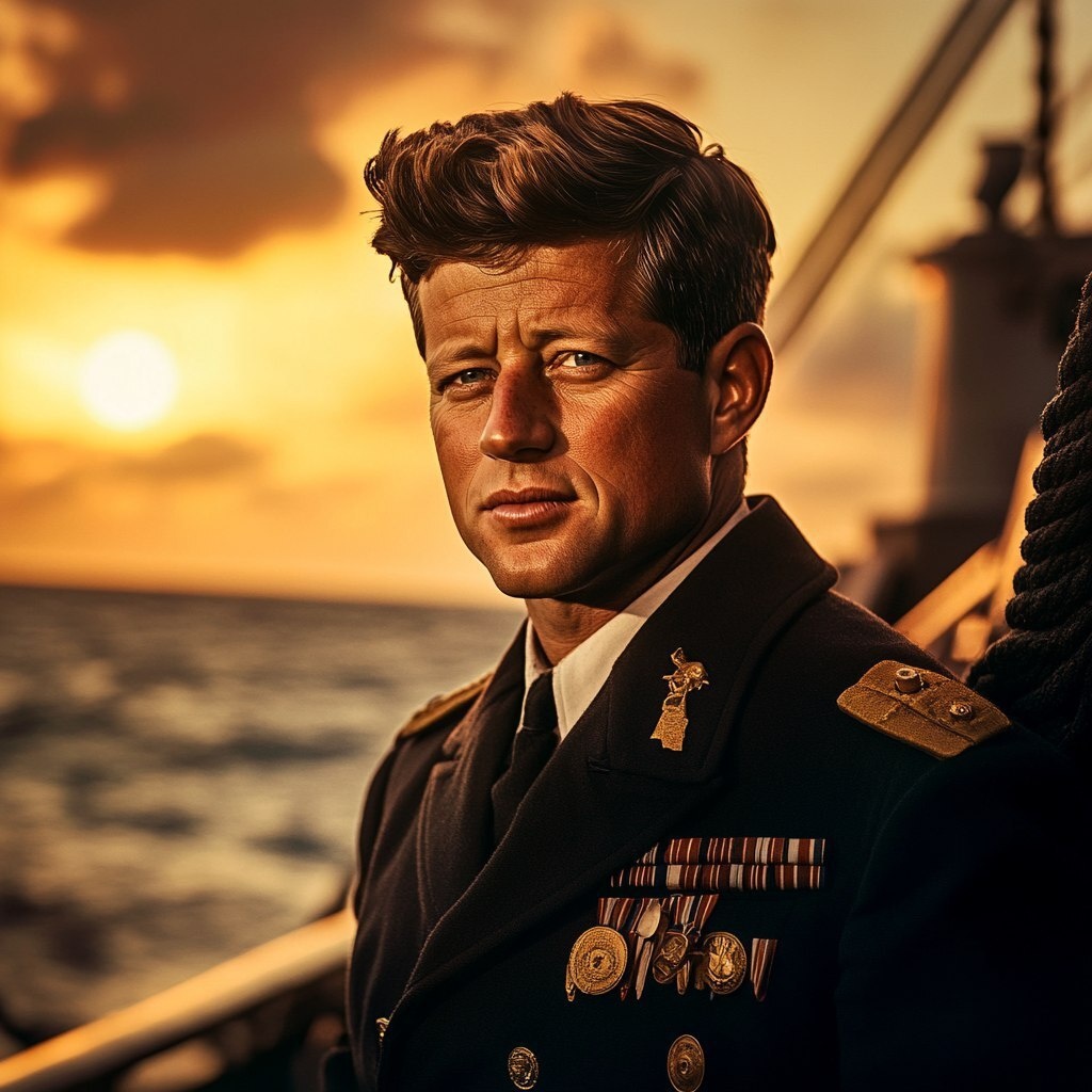 Создано на основе запроса: Young John F. Kennedy, wearing a World War II U.S. Navy officer’s uniform, standing confidently on a naval ship deck. The sun sets behind him, casting a golden glow over the ocean. His face is determined yet charismatic, with the wind slightly tousling his hair. The image has a cinematic, historical documentary feel.