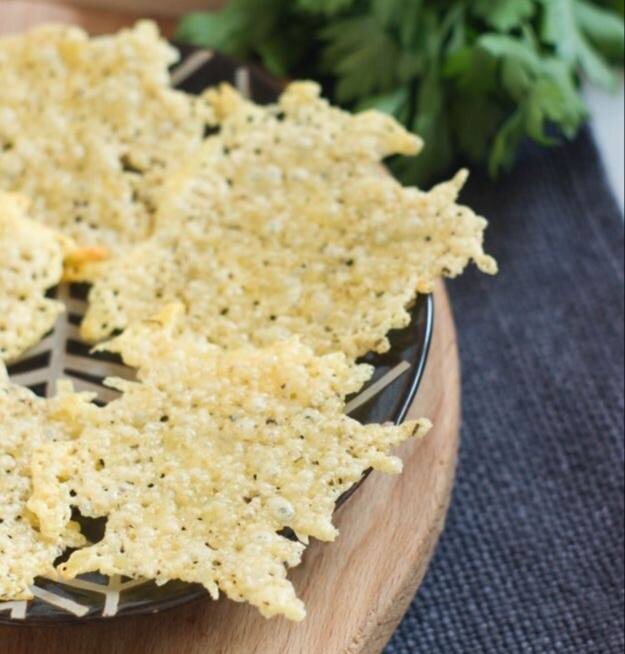 1․ Натрите сыр на крупной тёрке и выложите небольшими порциями на противень, покрытый смазанной растительным маслом бумагой или силиконовым ковриком для выпечки.
