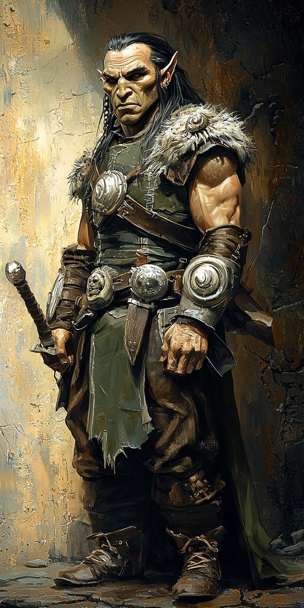 Создано на основе запроса: High fantasy character, male half-orc ranger, full body portrait, dynamic pose, realistic face, realistic anatomy, intricate, insane details, D&D character, dungeon background, great illustration, ultra realistic, well detailed, intricate, hyper detailed background, hyper intricate background, cinematic shadows, cinematic lights, cinematic reflections, non-euclidean geometry, high contrast, depth of field, intricate details, hyper realistic