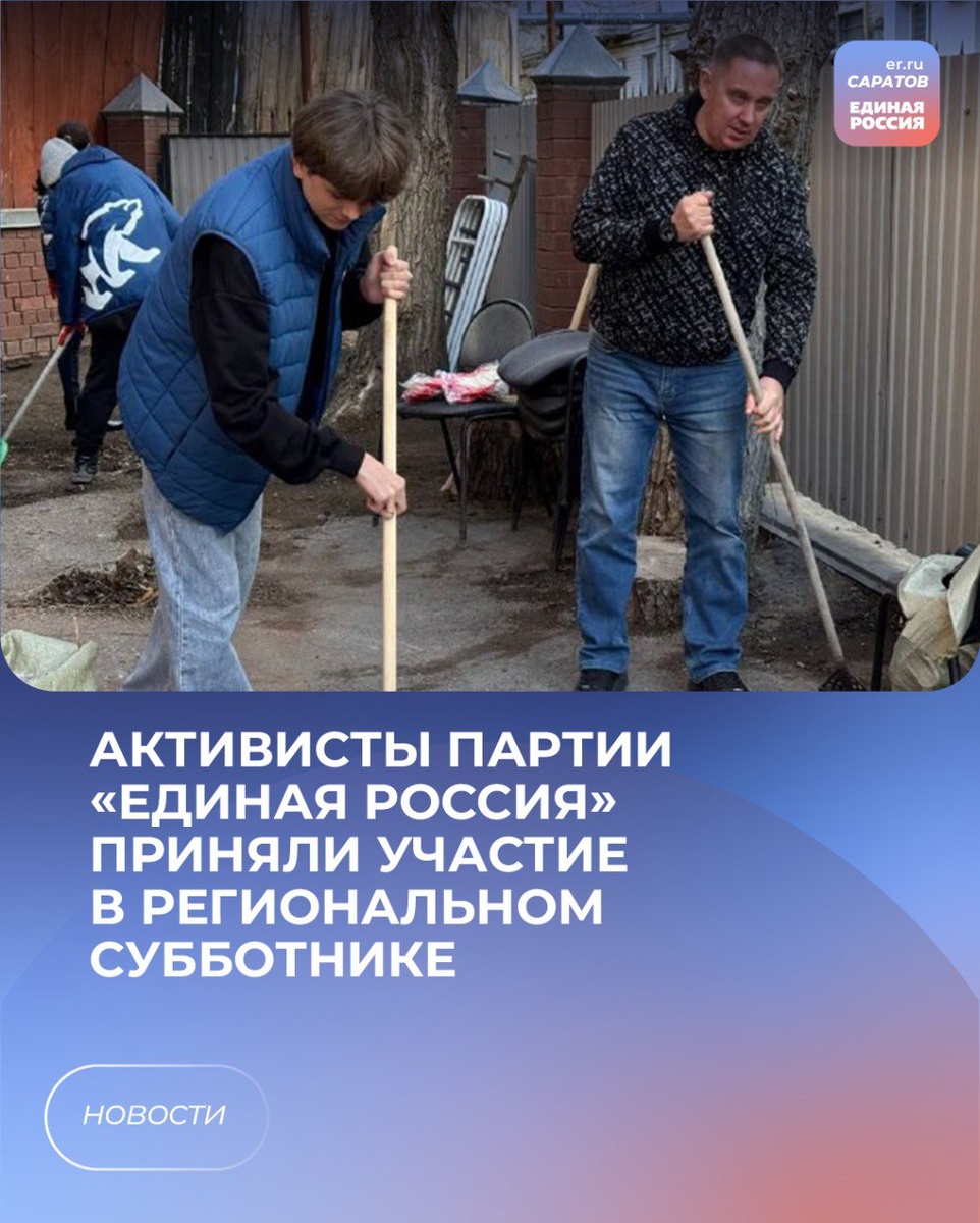 🧹 Губернатор, секретарь реготделения партии «Единая Россия» Роман Бусаргин назначил первый в 2025 году региональный субботник на 29 марта. 💬«В первую очередь уделим внимание паркам, скверам и зеленым зонам, где горожане любят проводить свободное время, а также тротуарам и остановкам общественного транспорта», - отметил глава региона Роман Бусаргин. Волонтеры и активисты партии «Единая Россия» также принимают участие в субботниках во всех районах области. Руководитель регионального исполкома партии, депутат Саратовской областной Думы Сергей Гладков рассказал, что сотрудники регионального исполкома убрали прилегающую территории и высадили деревья. 💬«Традиционно члены партии принимают активное участие в субботниках. Приводим в порядок общественные пространства, высаживаем деревья особое внимание уделяем мемориальным комплексам в честь защитников нашей Родины. Субботники продляться вплоть до мая», - подчеркнул Гладков.