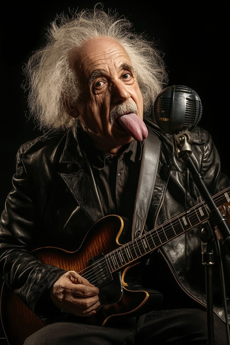 Создано на основе запроса: full body view of Albert Einstein WITH HIS TONGUE OUT OF HIS MOUTH characterized as a rock singer dressed in tight leather jacket and pants with an electric guitar and in front of a vintage microphone from the 1930s, pale rose tones, black backgound, high contrast, low key light style raw --- Автоперевод: Взгляд на полное тело Альберта Эйнштейна с языком из рта, характеризуемое как рок -певец, одетый в узкую кожаную куртку и брюки с электрической гитарой, и перед винтажным микрофоном 1930 -х годов, бледно -розовые тона, черный задний, высокий контраст, низкий светлый стиль света. Отлично выглядит? 🤔 https://dzen.ru/id/65c0c65c86e4f837c27b24d7 #ИИ #AI #нейросеть #midjourney #art