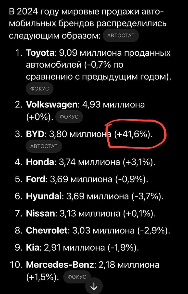 Я писал выше, что с недавних пор стал фанатом китайского автопрома. Они стали делать очень крутые авто по ценам ниже немецкой тройки. На днях увидел отчеты о продажах за прошедший год. Не удивительно, что BYD теперь располодился на третьем месте. Вы только посмотрите на прирост их продаж. 41% за последний год. Они такими темпами точно скоро выйдут на первое место. Фольскваген точно в этом году обгонят! ✉️ Телеграм канал | 📷 Инста