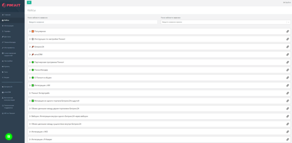 Для удобства пользователей Пинкит, мы группируем кейсы с описанием интеграций и их шаблонами по категориям. Здесь можно найти нужный раздел и выбрать интересующий кейс, который относится к вашему сервису. Чтобы раскрыть категорию, нажмите на значок "❯" перед названием кейса: