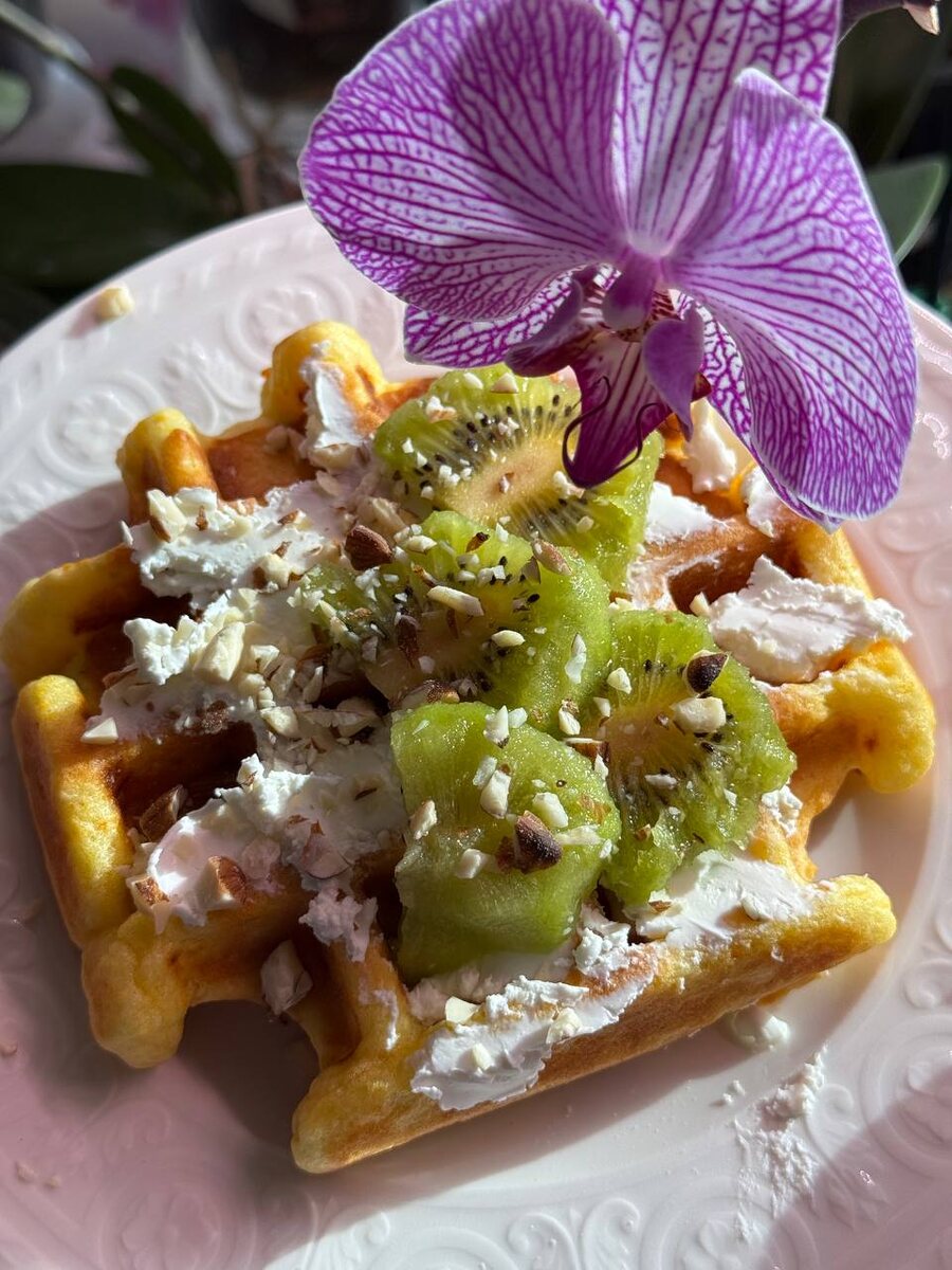 Доброго дня! Чем порадовать себя в выходные, как не сладкими вафлями! Если у вас завалялась парочка апельсинов или мандаринов, то можно сделать великолепные вафли для завтрака или перекуса. Ингредиенты: Способ приготовления: 1. Тщательно моем наши апельсины или мандарины. На мелкой терке снимаем цедру и выжимаем сок обоих фруктов в ту же миску. 2. Добавляем яйца, кефир и растопленное сливочное масло. Перемешиваем всё между собой. 3. Добавляем сухие ингредиенты и замешиваем тесто. Можно добавить тут ложечку сахарозаменителя или 100 г сахара, если хотите ярковыраженный сладкий вкус. Я не добавляю, так как могу потом добавить сладости топпингами. 4. В идеале дать тесту постоять 10-15 минут, чтобы кефир и разрыхлитель начали свою работу в тесте, делая итоговый продукт пышнее и воздушнее. 5. Прогреваем вафельницу и выпекаем вафли по 7 минут. Я сервировала свою вафлю с творожным сыром, киви и дробленым миндалем. Выбирайте ваши любимые сочетания и наслаждайтесь десертом! Видеорецепт: