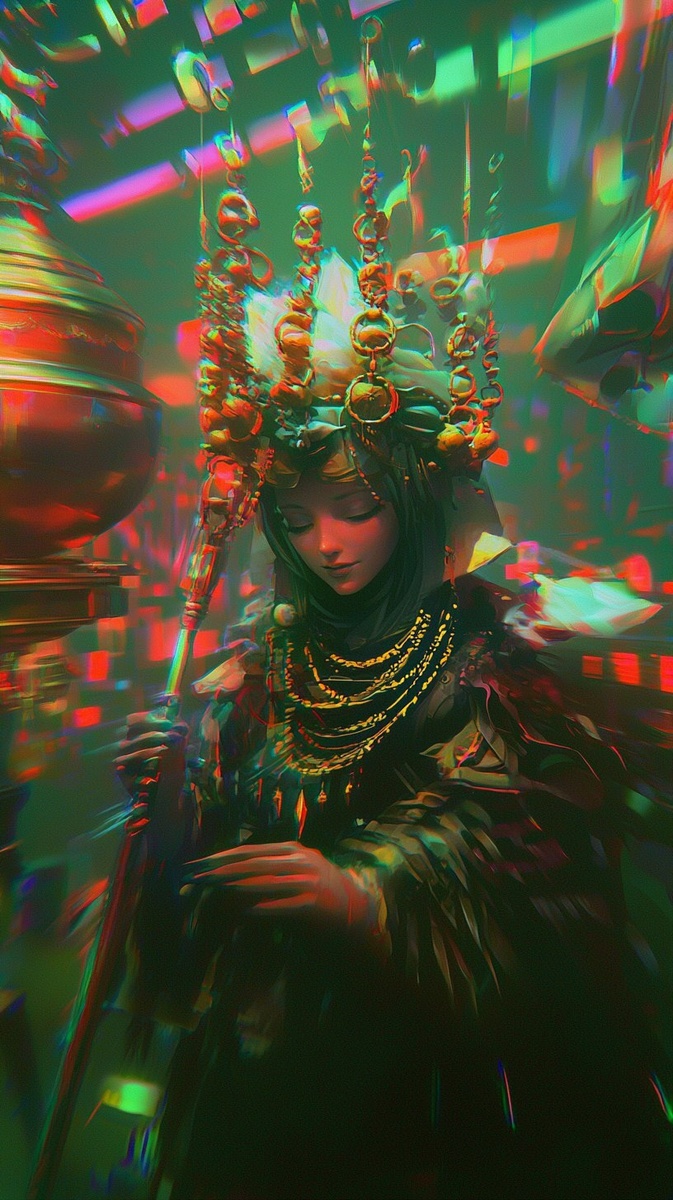 Создано на основе запроса: A beautiful female gnome, with red skin and short hair in an ornate headdress, carries a staff of office adorned with golden rings that hang from its top. She is dressed in the style of Greg Rutkowski's regal portrait of a queen, wearing muted colors. In the background behind her, there is an elaborate samovar made of gold and silver, in a fantasy digital art style, with a dark fantasy aesthetic.