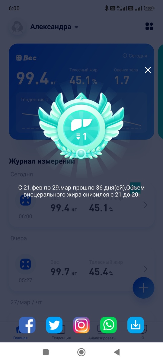Приветствую подписчиков и гостей канала! 1. Вес. Сегодня получила от приложения к весам очередной орден Сутулого😂, ещё на один пунктик снизился висцеральный жир. Ура!!! И вес меня обрадовал!!! 2. Завтрак. Чиабатту кусочками залила омлетной смесью, поверх положила несколько шариков моцареллы. Так же зелень и овощная нарезка. Что-то после бассейна пошло не так, приехала домой и захотелось есть. Решили с мужем попить кофе с мясом прессованным, сыром и так два раза, в 11 часов и в 15. Незнаю, почему нельзя было просто нормально пообедать.🤔🤔🤔 3. Так что обеда, как такового не было, а было два перекуса, плюс черри ещё были. 4. Ужинали у родителей мужа, я налегала на овощи и мясо. 5. Шаговая активность. Сегодня моя батарейка разрядилась, и время было, и даже желание было пойти погулять, но сил не было. Последнюю неделю практически не сплю, лежу по полночи и смотрю в потолок. Решила один денёк побыть в режиме энергосбережения. Так что, только бытовая активность. Заглядывайте в рубрику бе